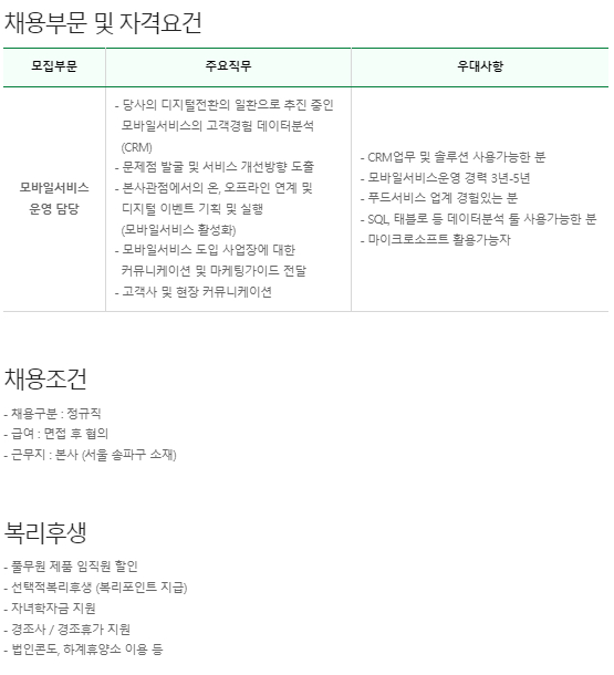 [채용]풀무원 모바일서비스 운영 담당 채용 공고 안내