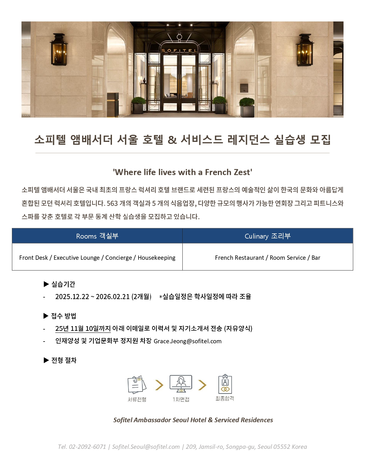 [홍보] 2025 동계 소피텔 앰배서더 서울 호텔 & 서비스드 레지던스 각 부문별 실습생 모집 (~11/10)